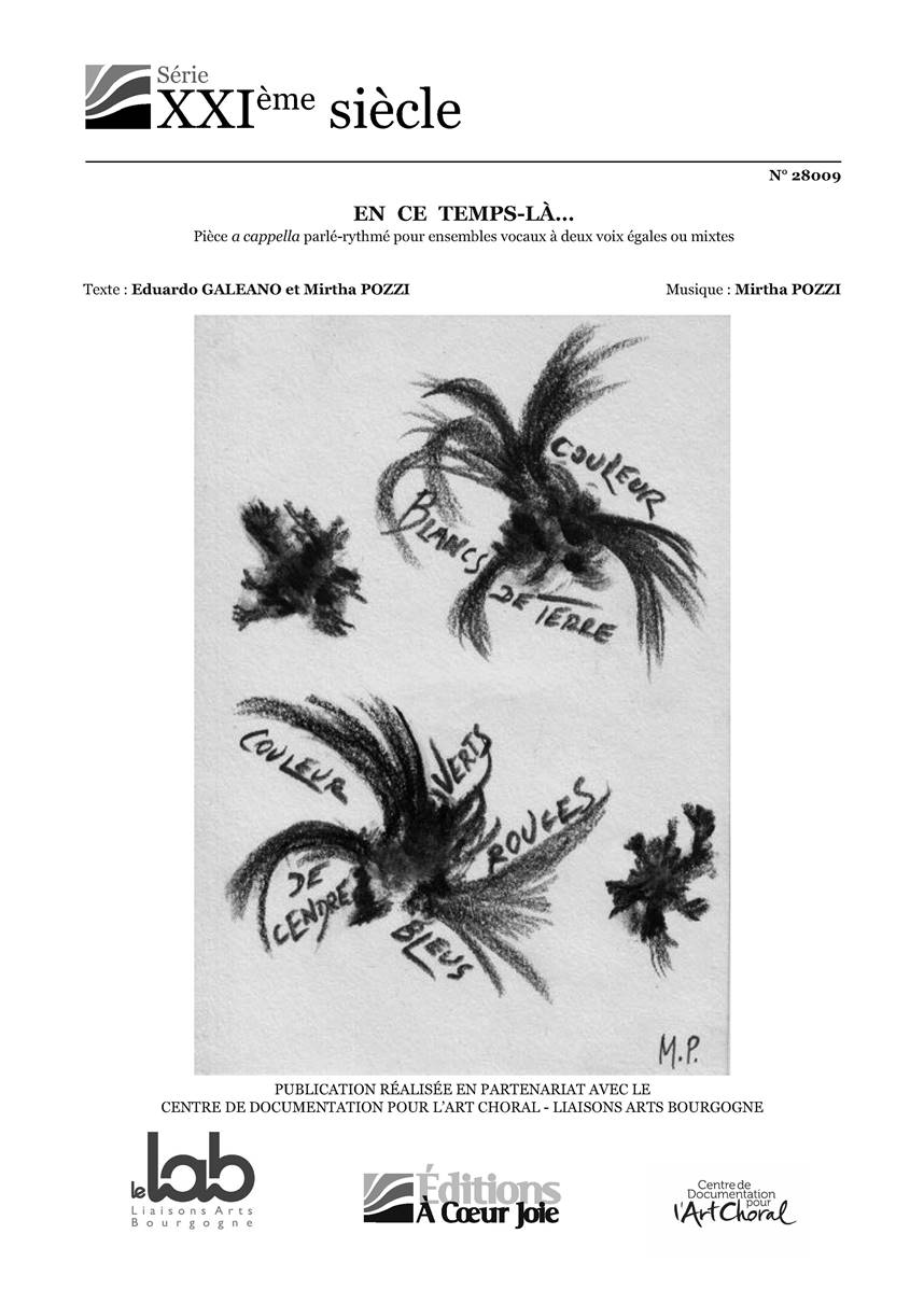 Pour voix mixtes ou voix égales.Oeuvre en parlé-rythmé.Les textes qui nous viennent des Indiens d’Amérique précolombienne sont une source d’enseignement et leur pensée symbolique, leur parole, deviennent poésie. Les mythes « mobilisent » nos rêves, nos souvenirs, et nous rapprochent de l’homme primitif en quête de réponses face aux énigmes de l’existence. Le texte « Les couleurs » d’Eduardo Galéano (écrivain uruguayen) s’est inspiré d’un texte de Benjamin Péret (poète surréaliste) lui-même basé sur un mythe des Indiens Kadiueu du Mato Groso (Brésil). Dans « En ce temps-là… », les chanteurs sont invités à « jouer » l’histoire en la « colorant » avec la parole rythmée. Le récit donne une réponse à la question : comment les oiseaux qui étaient tous blancs sont devenus si colorés ? Passionnée par cet univers des mythes précolombiens, Mirtha Pozzi a déjà réalisé un travail musical sur des textes du Popol Vuh et d’Eduardo Galeano : « La Serpiente inmortal et autres mythes précolombiens », qui a donné lieu à un spectacle et un CD chez Buda Musique.