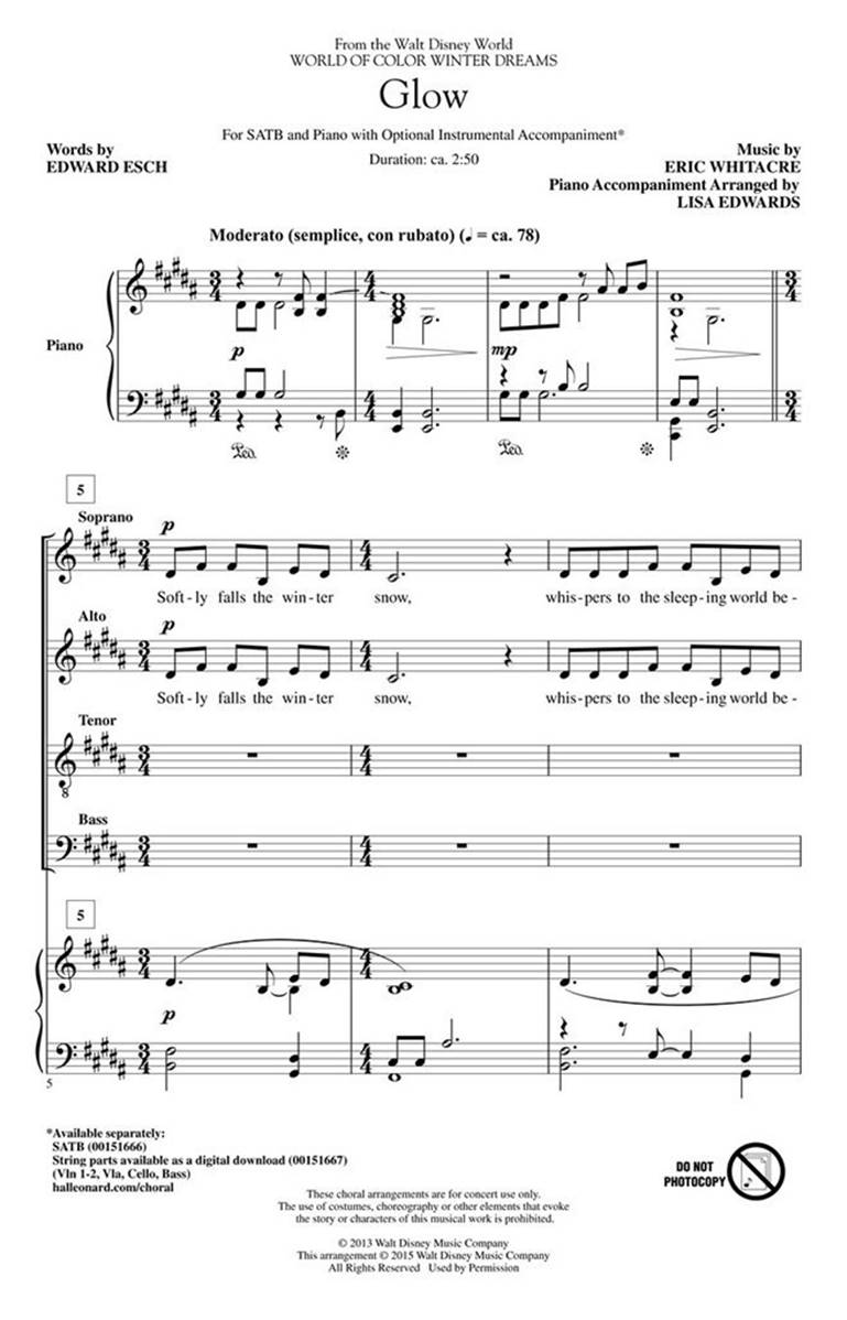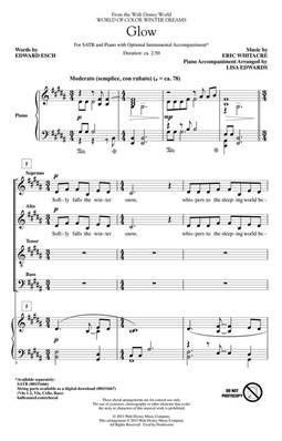 Glow, chant de Noël composé par d'Eric Whitacre sur des paroles d'Edward Esch pour chœur SATB avec accompagnement de piano (arrangé par Lisa Edwards) :