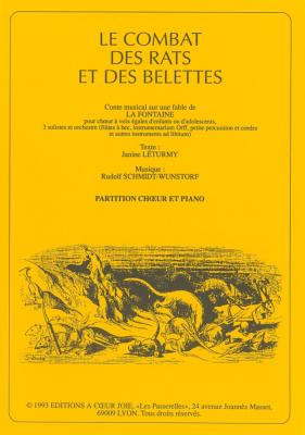 Le combat des rats et des belettes, jeu musical (opéra bouffe) sur une fable de La Fontaine Jeu musical écrit par Janine Leturmy et mis en musique par Rudolf Schmidt-Wunstorf pour chœur de 2 à 3 voix égales, flûtes, clarinettes, trompettes, trombones ad libitum, percussions, piano et cordes.