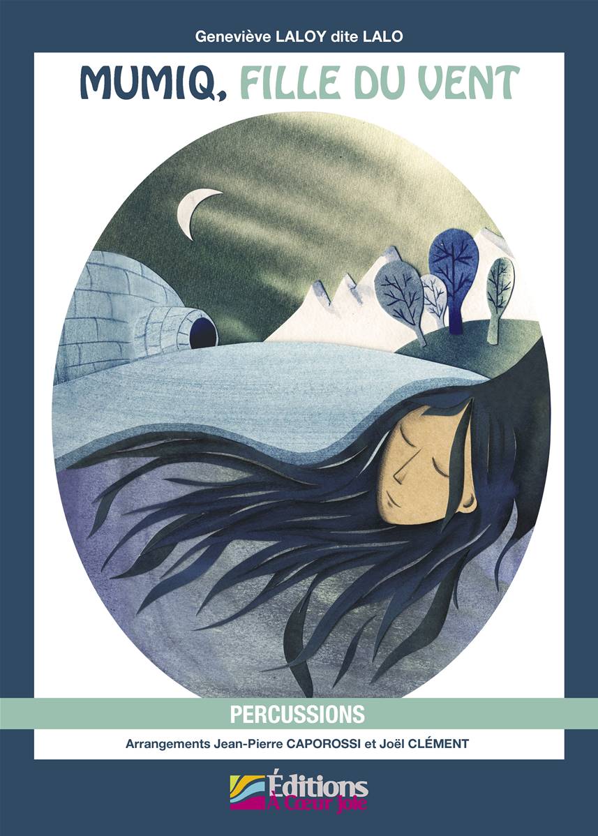 Partition de percussions de Mumiq fille du vent, conte musical pour chœur d’enfants de Geneviève Laloy dite LALO, arrangé par Jean-Pierre Caporossi et Joël Clément.