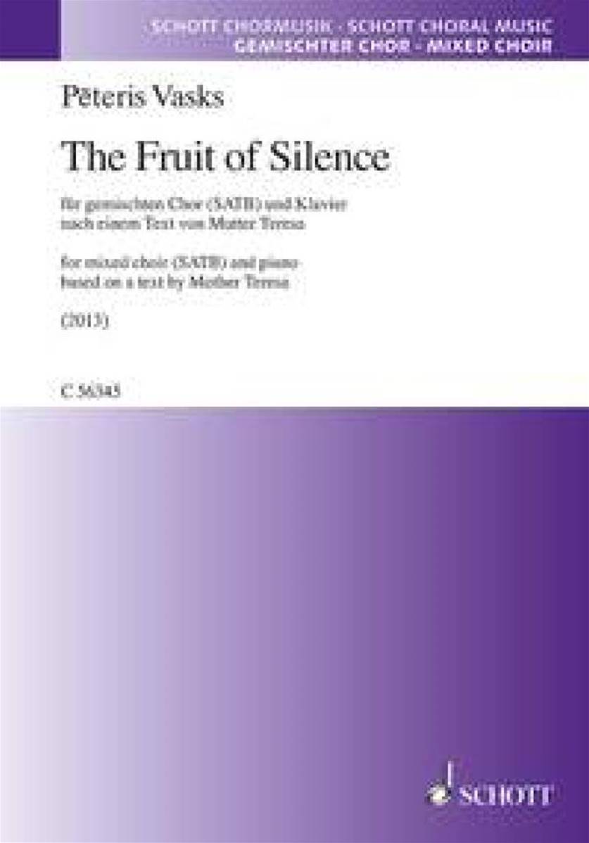 Mère Theresa aimait surprendre ses interlocuteurs en leur remettant une petite carte au lieu des cartes de visite traditionnelles, sur laquelle on pouvait lire un petit texte qui commençait comme suit : « The fruit of silence is prayer ». En 2013, Pēteris Vasks a mis en musique cette prière pour la paix à la suite d’une commande du festival de musique de Schleswig-Holstein, pour chœur mixte a cappella sous la forme d’un courant sonore élégiaque. Les versions pour quintette avec piano ou quatuor à cordes rendent cette mise en musique des mots de Mère Theresa accessible à deux genres traditionnels de la musique de chambre.